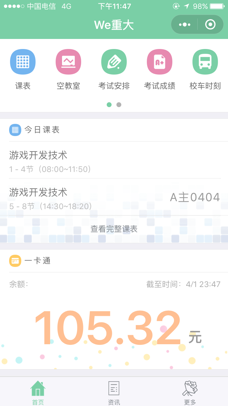 课表、成绩、考试、空教室、一卡通、借阅、电费、资讯,你所需要的全都有。